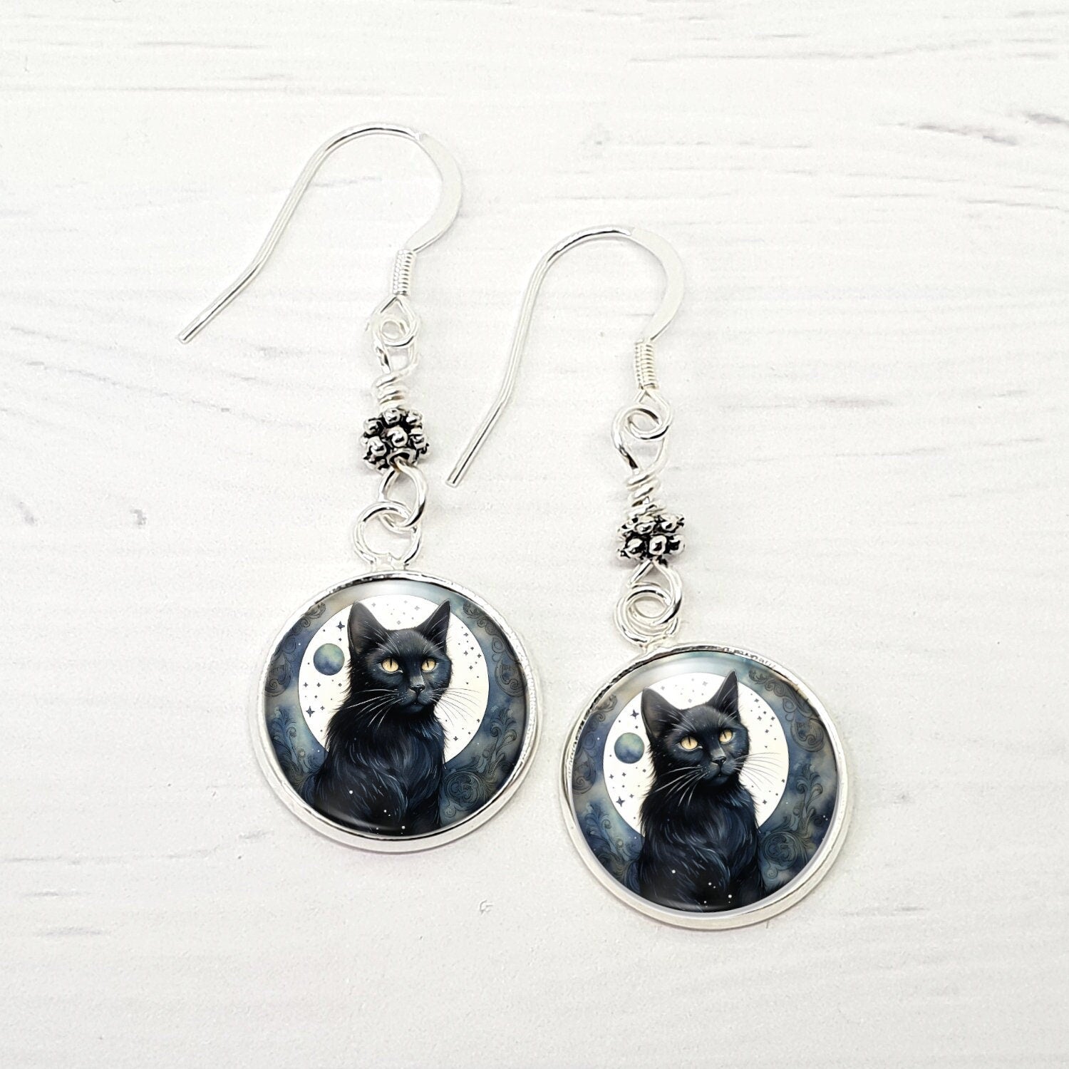 Unique black cat earrings. These beautiful sterling silver dangle earrings feature my original black cat design with a dash of mystical charm. A perfect addition to any cat lover's jewelry collection!