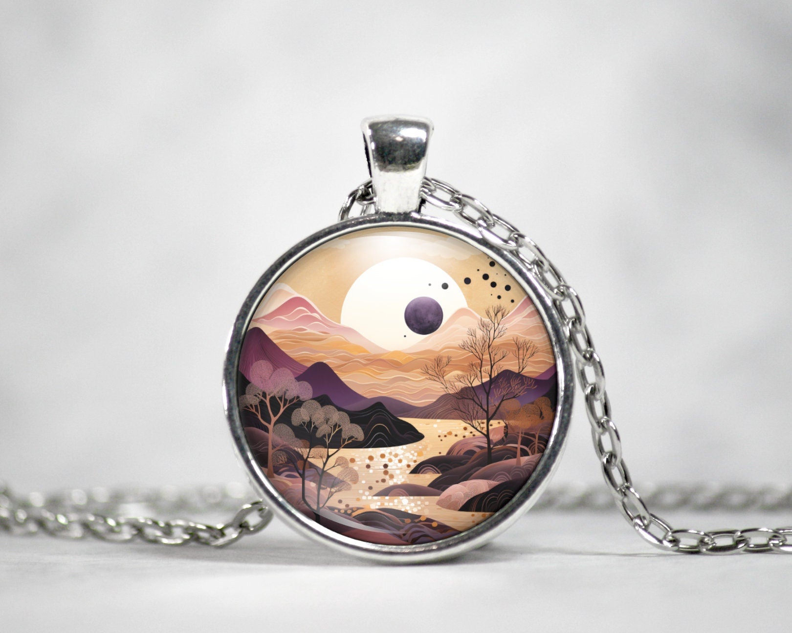 This unique necklace features my original mountain landscape design that features a beautiful mountain scene with river and moon. Perfect for nature lovers, hikers, and travel enthusiasts.